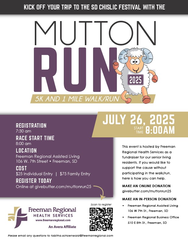 The community is invited to kick off the South Dakota Chislic Festival with the Mutton Run 5K and 1-Mile Walk/Run on Saturday, July 26, 2025, at Freeman Regional Assisted Living, located at 106 W. 7th Street, Freeman, SD.