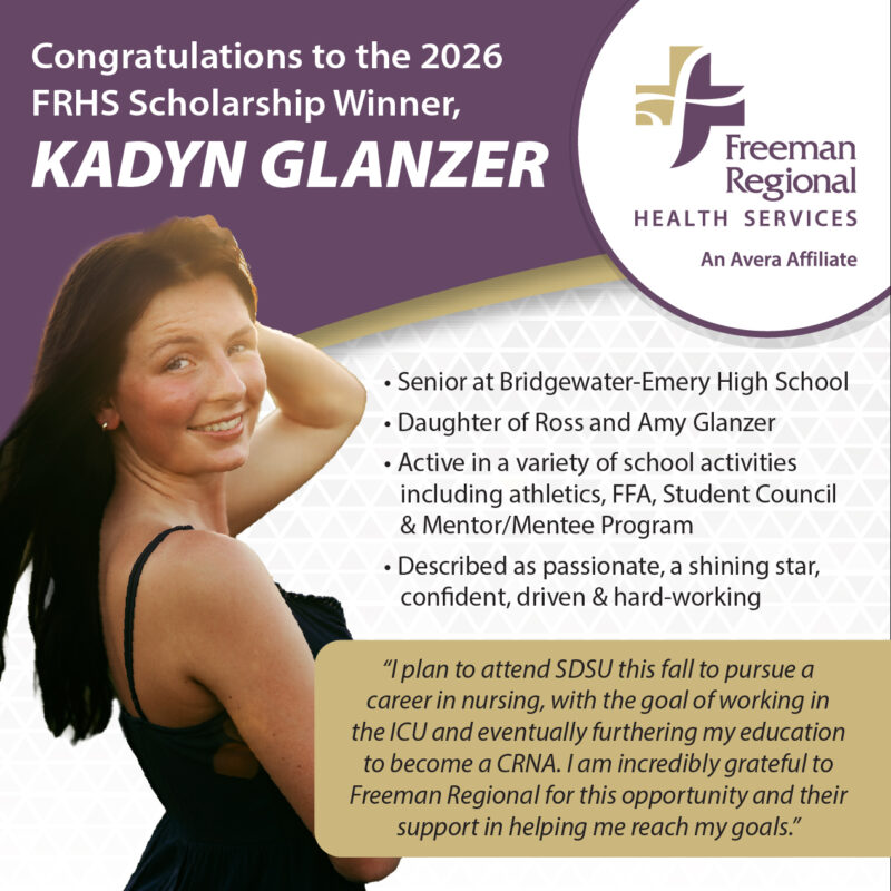 Freeman Regional Health Services (FRHS) awards an annual $1,500 scholarship to provide resources to a high school senior who demonstrates exceptional promise and a commitment to pursuing a career in the medical field through higher education. Graduating seniors from Freeman Public, Freeman Academy, Bridgewater-Emery, Marion, and Menno are all invited to apply. After careful consideration, we are proud to announce Kadyn Glanzer of Bridgewater-Emery High School as the recipient of the 2026 Freeman Regional Health Services Scholarship.
