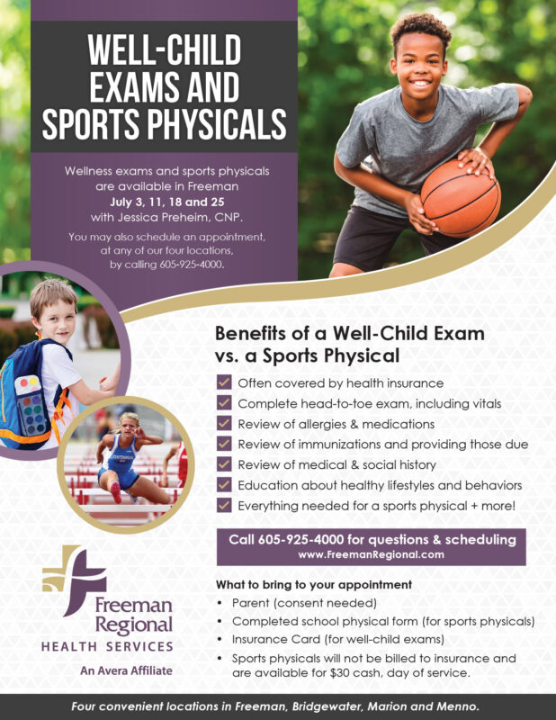 Wellness exams and sports physicals are available in Freeman on July 3, 11, 18 and 25 with Jessica Preheim, CNP. You may also schedule an appointment, at any of our four locations, by calling 605-925-4000. View the attached image sharing the benefits of a well-child exam and what to bring with your child.
